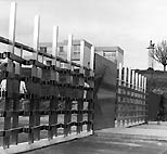 1976, Mur d’entrée, 200 x 200 cm, Structures grilles 200 x 600 cm, acier inox, ESEAT Rennes.