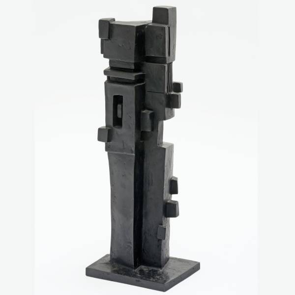 Cette première et unique fonte à la patine noire dans l'œuvre de V.Batbedat nous offre un autre regard sur la matière du bronze, non plus antique ni froid, non plus lisse et parfait. Les aplats de la terre initiale s'y retrouvent, aussi ses fragilités, de même que des détails et des volumes difficilement réalisables sur un métal brut. Cette traditionnelle ziggourat, contemporaine dans sa forme, l'est aussi dans cette autre histoire, qu'elle raconte de la matière, par ses ombres et lumières noires, notamment.